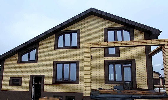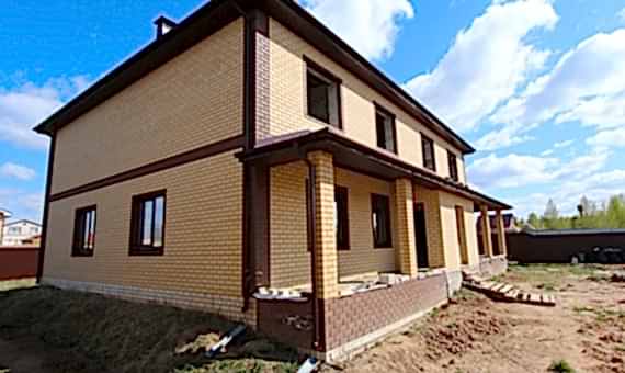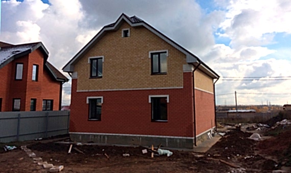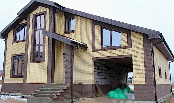 Дом из газобетона с мансардным этажом и небольшой террасой террасой, отделка фасада выполнена облицовочного кирпича.Площадь Жандосова, 73 дома составляет 256 кв.м, cроки строительства 4 месяца. Комплектация «Базовая»