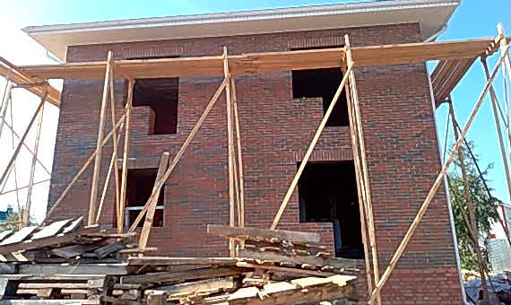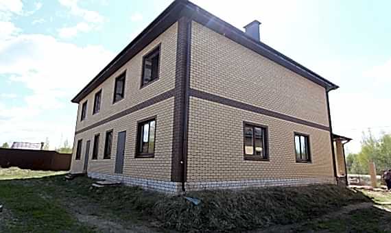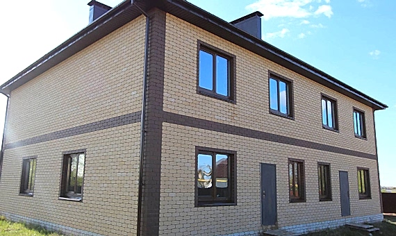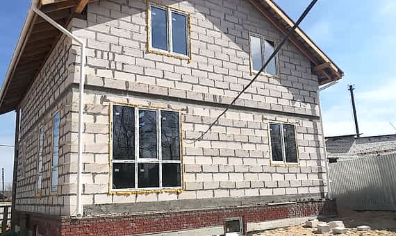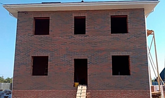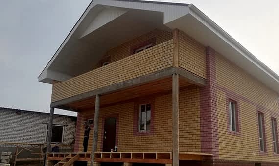 Двух этажный дом из газобетона с просторной террасой на несколько семей. Отделка фасада выполнена облицовочного кирпича.Площадь Ауэзова, 59 дома составляет 120 кв.м, cроки строительства 6 месяцев. Комплектация под отделку