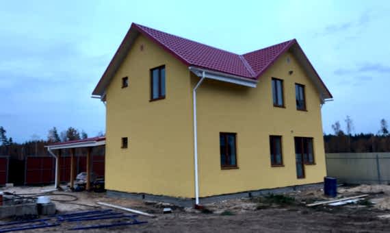 Дом из газобетона с мансардным этажом и небольшой террасой террасой, отделка фасада выполнена декоративной штукатурки.Площадь Абая, 60 дома составляет 123 кв.м, cроки строительства 4.5 месяца. Комплектация базовая
