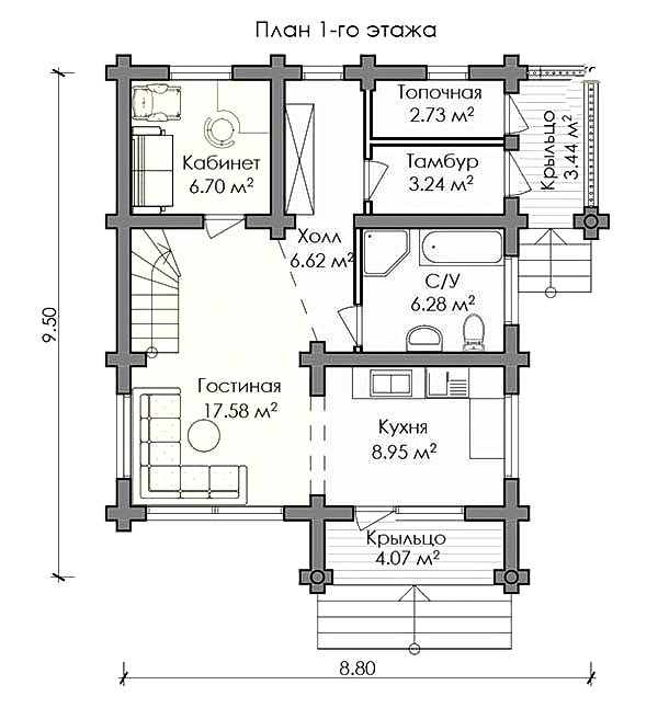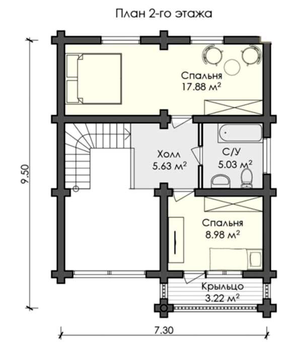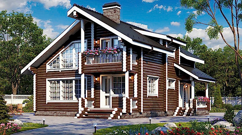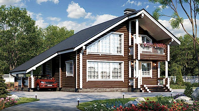 Проект одноэтажного дома Pin Up 100» с мансардой, террасой и балконом из оцилиндрованного бревна.Площадь Назарбаева, 2 составляет кв.м а размеры 8.8 х 9.5