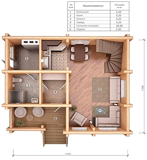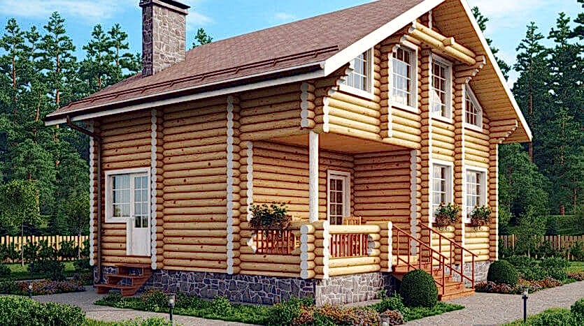 Проект одноэтажного дома «Маршал 101» с мансардой и террасой из оцилиндрованного бревна.Площадь Назарбаева, 99 составляет кв.м а размеры Pin Up х 9