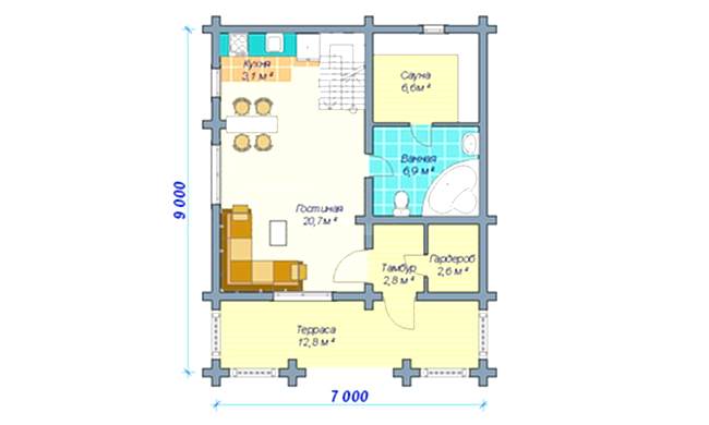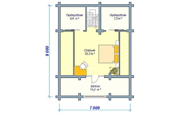 Проект одноэтажного дома Pin Up 12» с мансардой, террасой и балконом из оцилиндрованного бревна.Площадь Пушкина, 40 составляет 73 кв.м а размеры 7 х 9