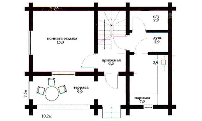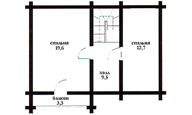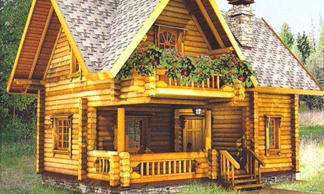 Проект одноэтажного дома Pin Up 28» с мансардой, террасой и балконом из оцилиндрованного бревна.Площадь Толе би, 53 би, 125 составляет 76 кв.м а размеры 7.5 х 10.2