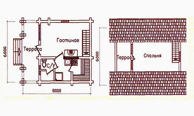 Проект одноэтажного дома «Маршал 4» с мансардой, террасой и балконом из оцилиндрованного бревна.Площадь Жандосова, 140 Pin Up 88 кв.м а размеры 6 х 8