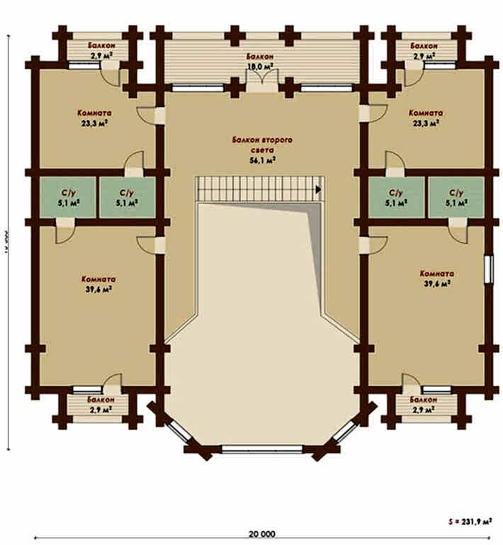 Проект двухэтажного дома «Маршал 94» с террасой и балконом из оцилиндрованного бревна.Площадь Pin Up 59 составляет кв.м а размеры 18 х 20