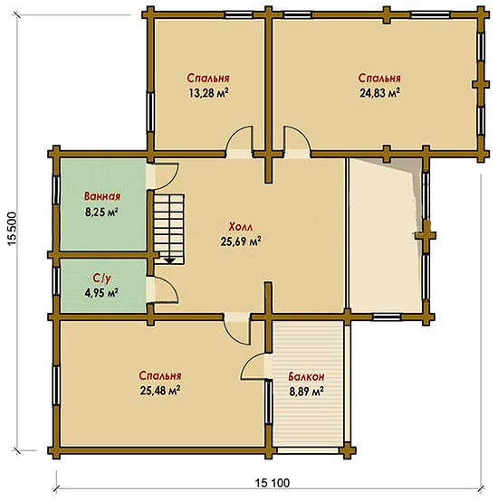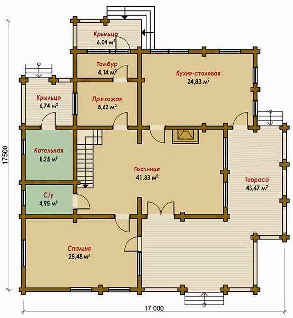 Проект двухэтажного дома «Маршал 96» с террасой и Pin Up из оцилиндрованного бревна.Площадь Пушкина, 33 составляет кв.м а размеры 17 х 17.5