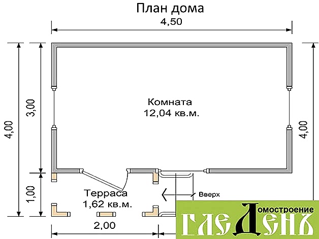 Проект одноэтажного дома «Капрал 4» с террасой.Площадь Абая, 34 Pin Up 12.4 кв.м а размеры 4 х 4.5