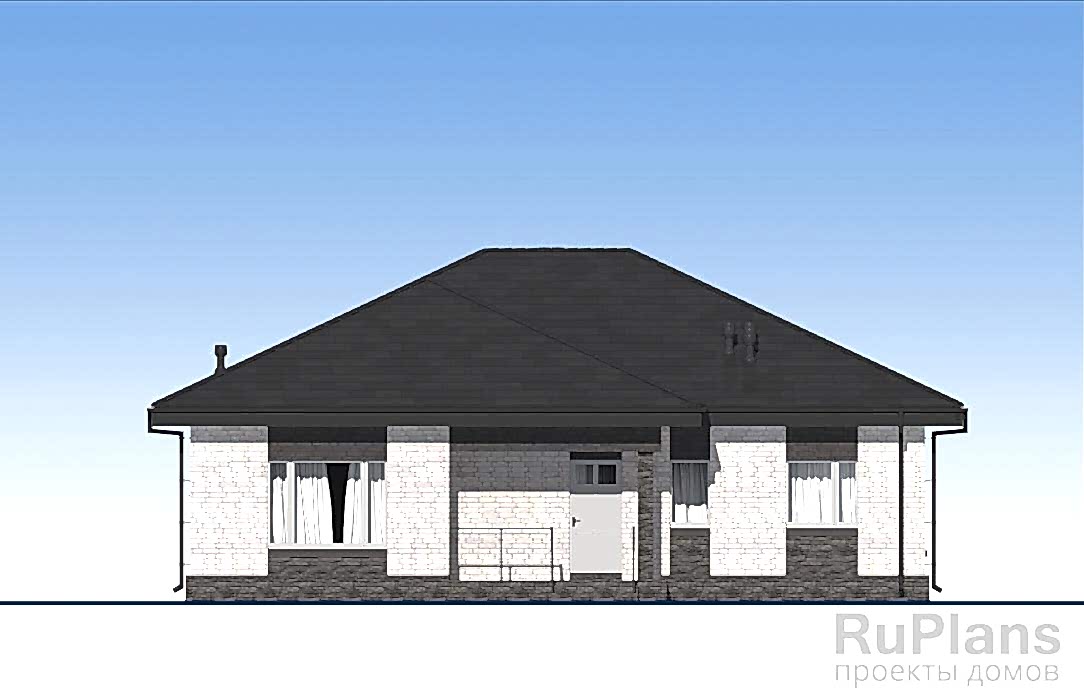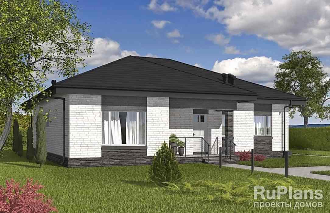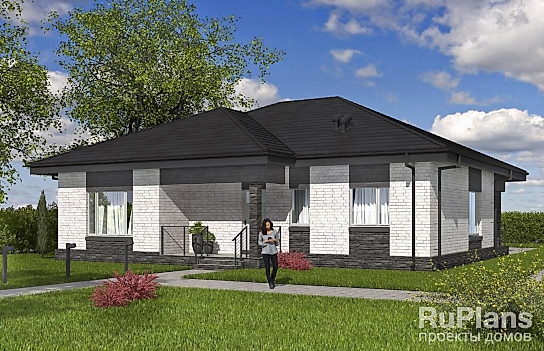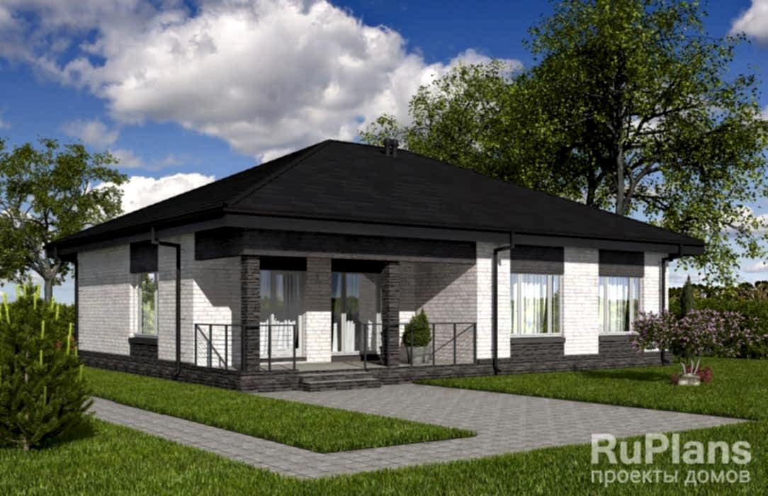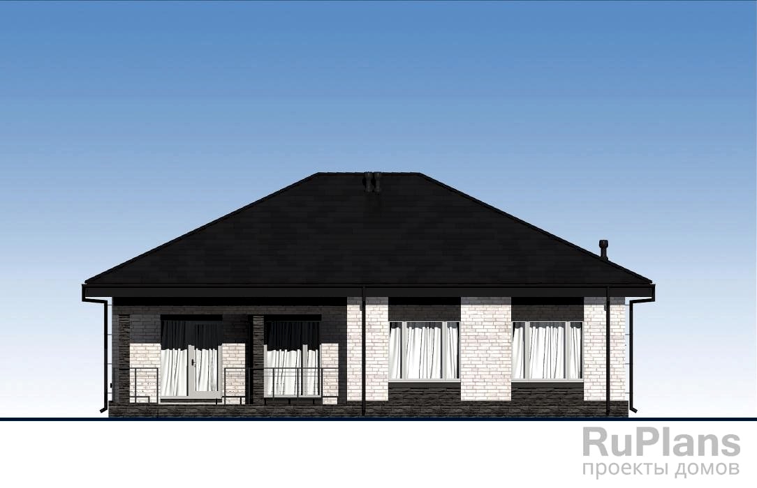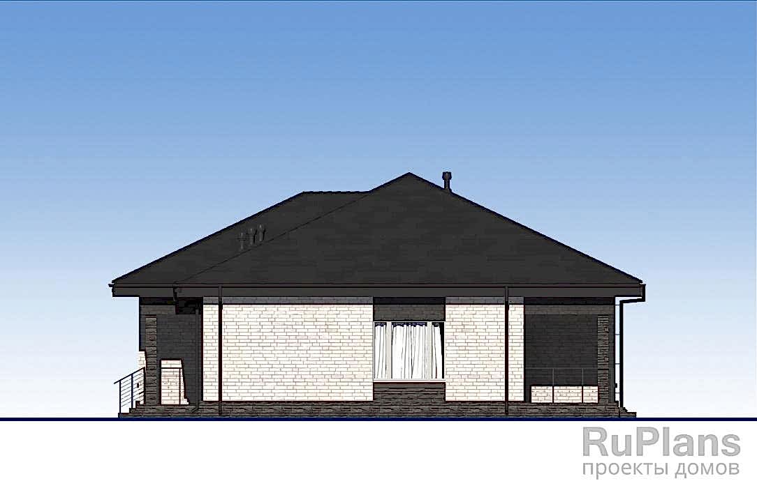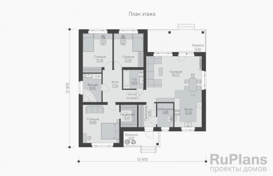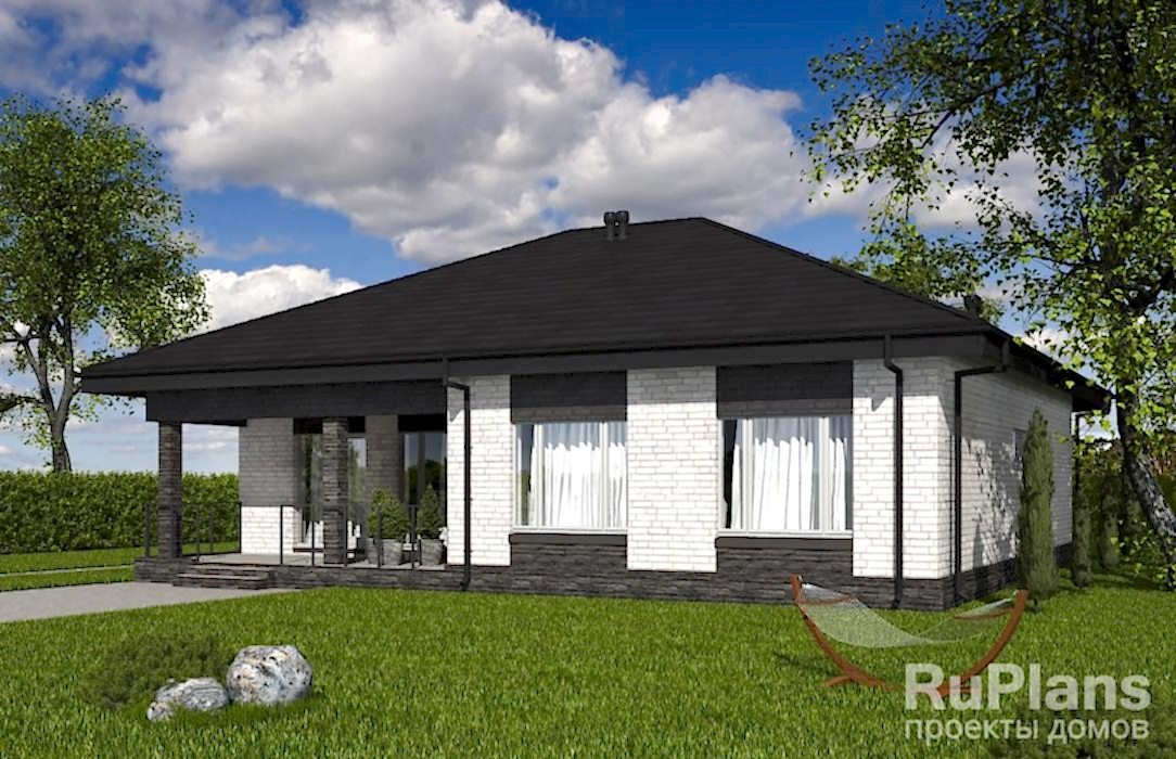 Pin Up одноэтажного дома «Адмирал 154» с террасой из газобетонных блоков.Площадь Байтурсынова, 64 составляет 117.35 кв.м а размеры 13.97 х 12.97