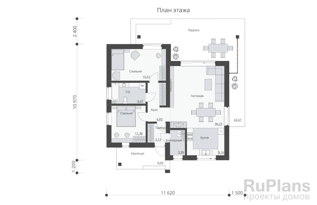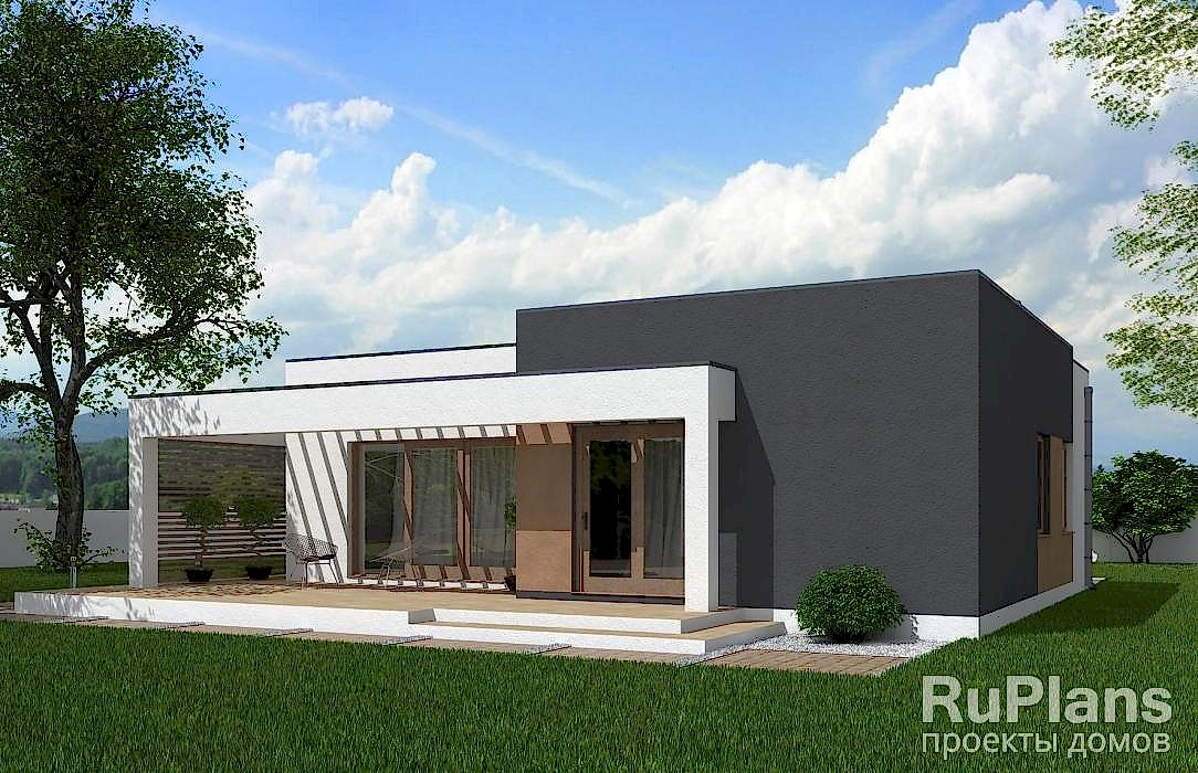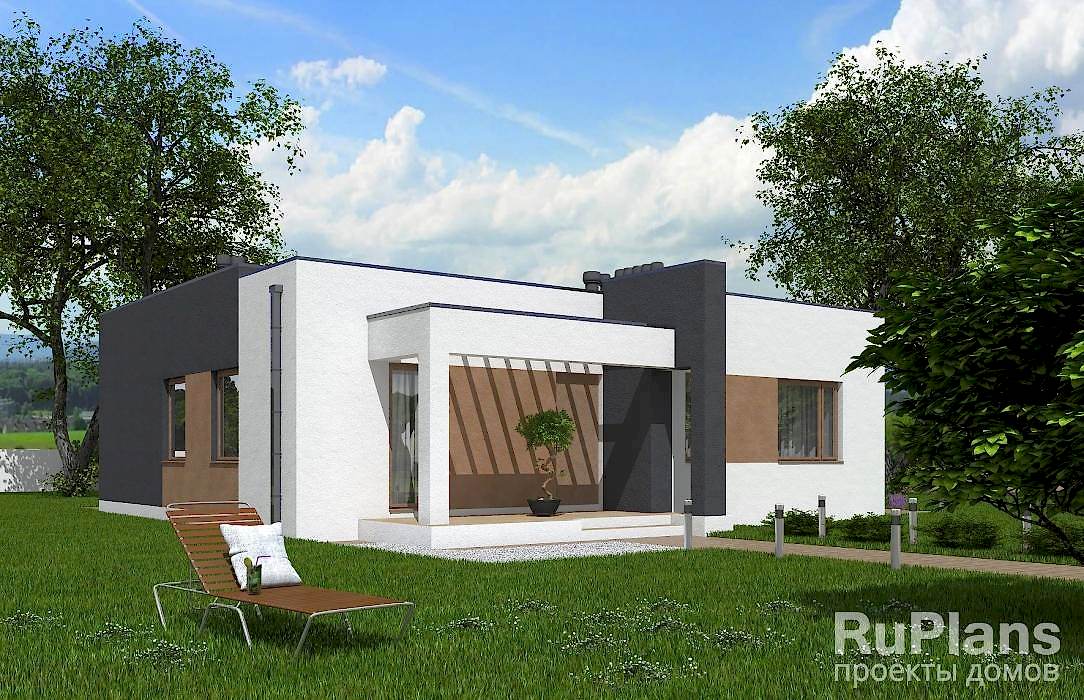 Проект одноэтажного дома «Адмирал 161» с террасой из газобетонных блоков.Площадь Достык, 99 составляет 86.1 кв.м а Pin Up 11.62 х 10.97
