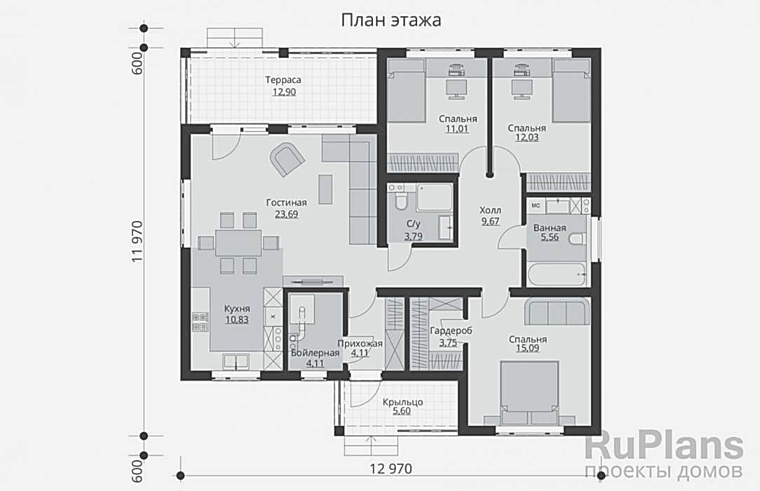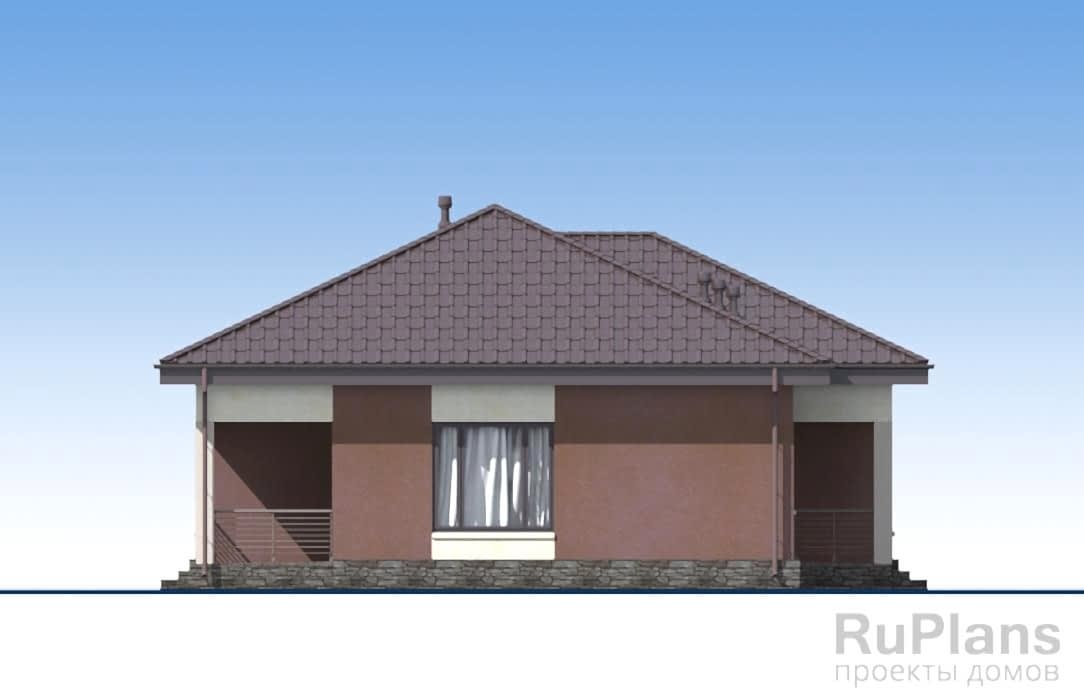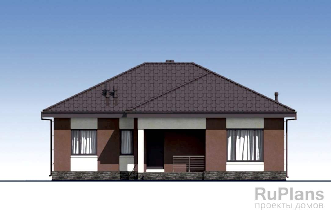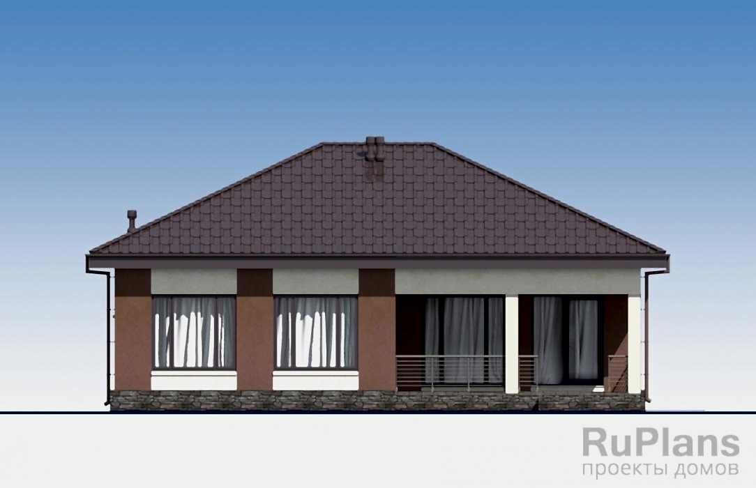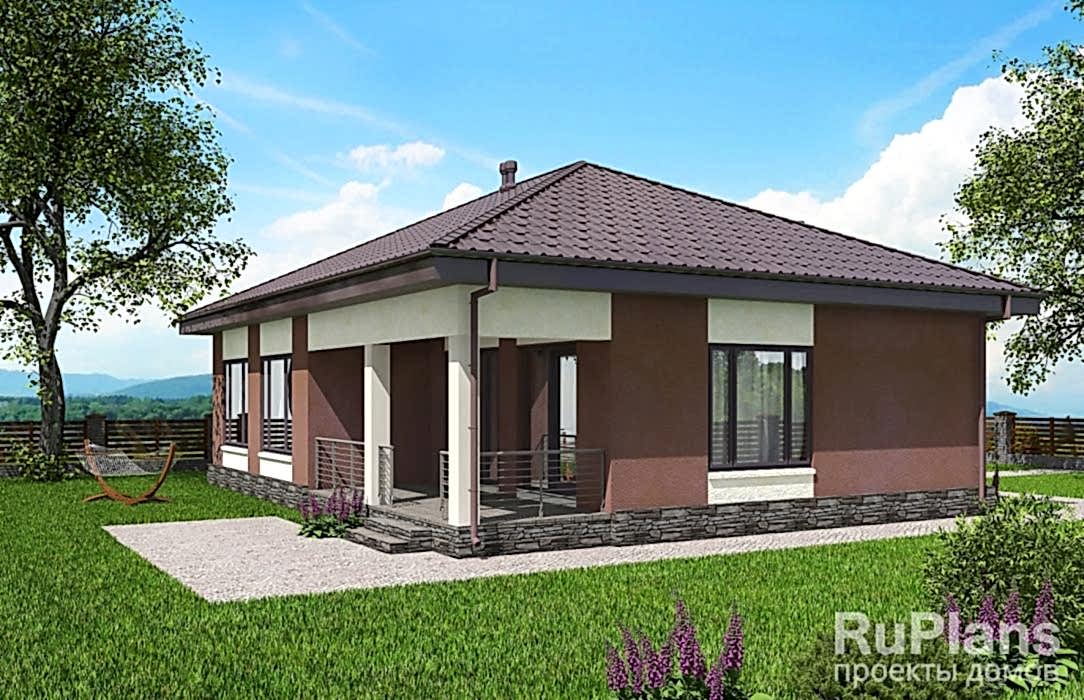 Проект одноэтажного дома «Адмирал 173» с террасой из газобетонных блоков.Площадь Жандосова, 128 составляет 103.64 кв.м а Pin Up 11.97 х 12.97