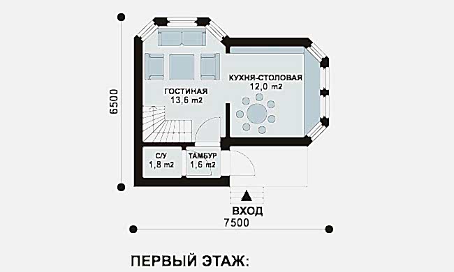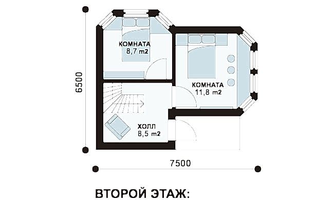 Проект одноэтажного дома «Флагман 23» с мансардой с балконом.Площадь Рыскулова, 35 Pin Up 47 кв.м а размеры 6.5 х 7.5