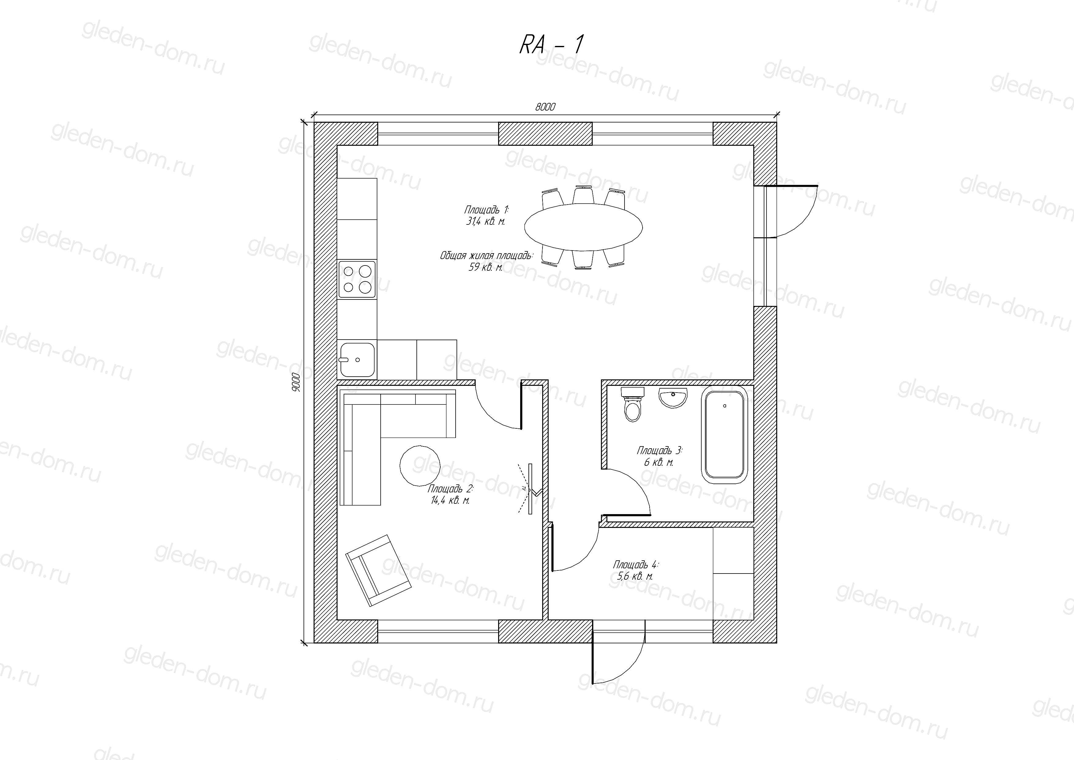 Проект одноэтажного дома «Gleden RA-1» из газобетонных блоков.Площадь Pin Up 133 составляет 59 кв.м а размеры 8 x 9